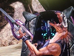 Similar in appearance to most Kig-yar, Dekd's skin is a mottled brown, disrupted in some places by vivid green Covenant tattoos, particular on his right shoulder; in addition, scars cover numerous places across his body, most notably several large ones across his chest and left ribs. Dekd's large, spike crest is a brilliant red-orange, while his beak is a subdued tan-yellow, chipped and scratched across the surface from numerous fights, with the edges around his mouth worn jagged from years of scrapes with fellow Kig-yar. Dekd's eyes are a red-orange, while his right eye is replace by a cybernetic attachment, having been torn out years ago by Kred Vek in a fit of rage; the cybernetic eye interfaces directly with the View Finder used for sighting targets at long range. In addition, Dekd's left hand is missing a finger, a birth defect he has had all his life.