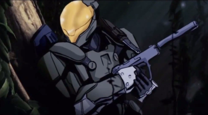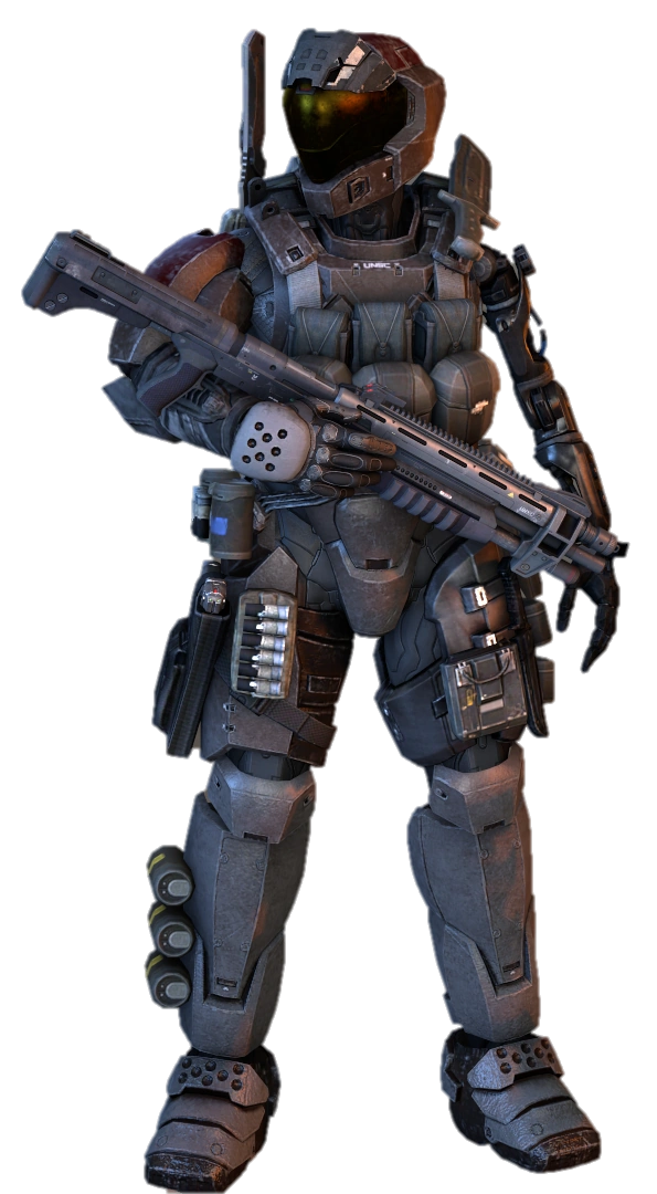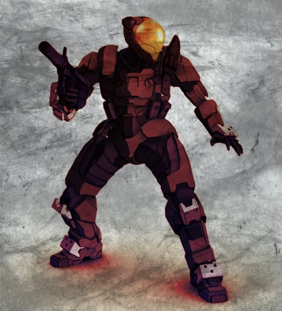 A relic of the Human-Covenant War, Simon’s suit of Semi Powered Infiltration armor is as battered and scarred as its owner. The body armor was originally intended to provide its Spartan-III owner with light protection and stealth capabilities; while the reflective paneling that made the SPI’s camouflage system possible has long since worn out, Simon has kept his weathered combat armor functional while augmenting it with his own custom improvements. Though the SPI armor lacks the speed and strength-enhancing abilities of powered armor systems such as the PISCES and MJOLNIR its structure acts as a load-bearing aid similar to the frame on a ruck pack, enabling Simon to carry his extensive fighting load without losing mobility. With large portions of the armor irreparably damaged in combat, Simon has replaced chunks of the original SPI with components scavenged from UNSC trooper gear, ODST combat armor, and even Sangheili combat harnesses.