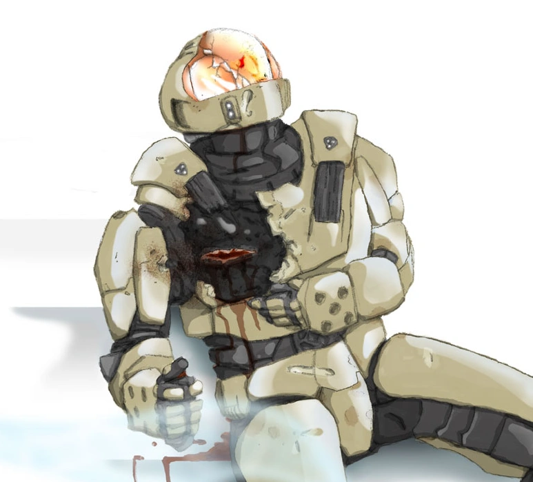 Wounded and in rapidly worsening health, Stray cared little for the meteoric changes rocking the galaxy. A pariah for his alliance with the Covenant he dared not turn to his old mercenary networks for resources or sanctuary. Fearful of the Kru'desh, the Syndicate, ONI, and even vengeful militia groups, Stray hid himself away from the universe as his mind and body deteriorated. His one resource was the captive Juno, who he kept as a last-ditch bargaining chip. Diana's twin viewed him with utter contempt and yearned to escape back to the UNSC. Unable to seek new allies or even beg forgiveness from his abandoned friends, Stray descended into a pit of anguished misery. Utterly alone, his body wracked by battle wounds and cloning sickness, Stray finally succumbed to despair and clumsily attempted suicide by throwing himself on his machete.